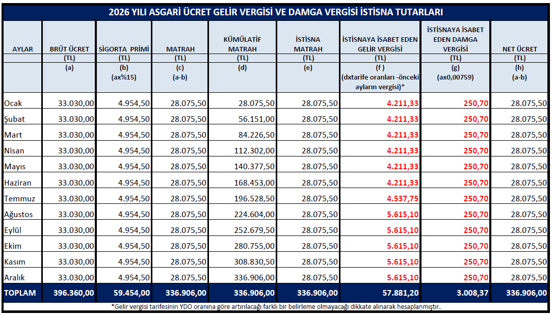 2026 Yılı Asgari Ücret Gelir Vergisi ve Damga Vergisi İstisna Tutarları